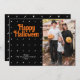 Cartão de Férias de Foto do Dia das Bruxas. Deseje um feliz Dia das Bruxas aos seus amigos e familiares com este cartão de uma única foto. Este design apresenta um padrão assustador em ambos os lados do cartão com fundo preto.
