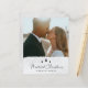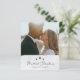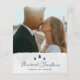 Um Cartão de Férias de Casamento Recém-casado de Natal casado, com árvores de Natal negras e brancas, caligrafia moderna e textura de papel. O verso tem uma segunda foto e uma mensagem pessoal mais longa. Clique no botão editar para personalizar este design com suas fotos e detalhes.