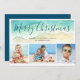 Mande saudações de estação quente com este cartão de Natal de praia. Os cartões com fotos costeiros apresentam uma onda de aquarela verde-marinha em uma costa arenosa. Letras no topo da onda dizem "Feliz Natal" em uma bonito cor azul-verde-oceano. Três fotos são colocadas abaixo da onda pintada. Para personalizar, adicione seus nomes e três fotos favoritas.