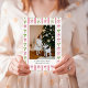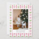 Cartão de férias com um fundo de papel de parede rosa e verde pastel bonito com uma foto da família emparelhada com um cartões de natal e seu nome e ano em uma fonte sans serif.