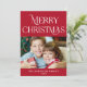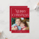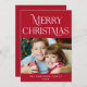 Cartão de férias vermelho sazonal moderno. "Feliz Natal" está escrito em tipografia branca elegante. Personalize com uma foto da família, seu nome e ano.