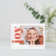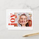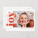 Este é um cartão postal de férias vermelho e branco brilhante e simples, apresentando uma foto minimalista única combinada com “alegria” em uma fonte serifada ousada e elegantemente clássica.