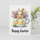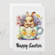 Cartão de Boas Festas com Aquarela Feliz Páscoa com Coelho em uma xícara de chá e flores