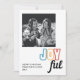 Colorida e mínima, tudo ao mesmo tempo. Um cartão de feriado verdadeiramente alegre. Cartão branco nítido com vermelho, dourado e letras de cor. Lugar para fotografia pessoal.