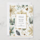 Envie votos calorosos e elegantes com este cartão de férias luxuoso verde e dourado. Com belos flocos de neve dourados, detalhes florais em aquarela, acentos de pinheiro, formas geométricas modernas e tipografia elegante, este design abstrato de inverno traz um toque sofisticado para os seus cumprimentos de temporada.