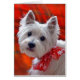 Este filhote de Westie está posando orgulhosamente, esportando uma alegre arco vermelha e branca de floco de neve para colocá-lo no espírito da temporada.