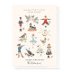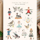 Uma ilustração de Natal adorável, pintada por Shelby Allison, com 1 papagaio em uma pera, 2 tartarugas, 3 galinhas francesas, 4 chamando pássaros, 5 anéis de ouro, 6 gansos por postura, 7 cisnes nadando, 8 moças ordenhando, 9 senhoras dançando, 10 senhores saltando, 11 pipers e 12 bateristas.