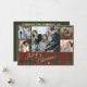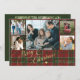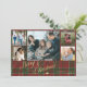 Elegant stylish Merry Christmas faux gold classic calligraphy script seven family photos red green plaid tartan rustic holiday card with your custom personalized text on both sides.