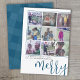 Design FRONT: Uma colagem de 9 fotos em uma grade simples para destacar muitas fotos do ano passado. A grade de fotos está fora do centro com uma borda fina ao redor das fotos. Uma busca moderna por um cartão com fotos de feriado com sotaques azuis denim e "feliz" em uma fonte grande, de moda e de script. O fundo é branco. Design de trás: o design de trás inclui um padrão de bloco em tons de azul. Você pode mudar essa cor na área de design avançado.