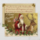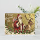 This vintage-style holiday card features a classic illustration of Santa Claus dressed in a traditional long red robe with white fur trim, carrying a sack overflowing with dolls and toys over his shoulder. He stands alongside a large reindeer, holding its leather bridle against a textured, gold-colored background. The scene is framed along the bottom by festive boughs of holly with red berries and mistletoe with white berries, while the greeting "A Happy Christmas Tide" appears in elegant white script on the upper left.