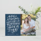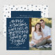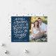 Envie cartões de natal mágicos para amigos e familiares com nosso cartão festivo de fotos. A frase "A magia do Natal nunca acaba, seus maiores presentes são família e amigos" é exibida em um roteiro branco, com letra branca, com fundo de marinho. Personalize a frente do cartão de feriado bonito adicionando seu nome, ano e foto. A placa reverte para incluir sua mensagem personalizada em dentro de texto branco de um quadro retângulo de marinho. O fundo apresenta um padrão de estrelas e pontos marinhos.