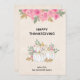 Cartão do Dia de Ação de Graças com abóboras brancas elegantes em aquarela com acentos de brilho dourado falso. Rodeadas por folhas verdes e flores silvestres cor-de-rosa.