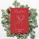 Fundo vermelho, e uma rena branca de abstrato 1 linha. Personalize e adicione um nome e ano. Texto: Feliz Natal. Voltar: adicione sua nota e seus nomes.