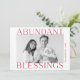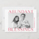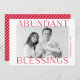 Cartão com fotos de férias colorido e moderno, com a expressão "Bênçãos Abundantes" em letras vermelhas. Personalize o cartão adicionando sua foto, nome e ano. A placa se reverte para exibir um padrão listrado vermelho e branco.