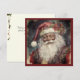 Este é um cartão de Natal antigo com um Papai Noel negro estilo Rococó. O cartão mostra o Papai Noel vestindo um casaco e chapéu vermelho ameixa com detalhes florais cor-de-rosa. As cores da imagem são principalmente vermelho, branco e rosa, com detalhes em marrom escuro. O tema geral da imagem é festivo e tradicional, representando a figura icônica do Papai Noel durante a temporada de festas.