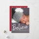 Acredite Roteiro Natal de Babá Primeira Foto Moderna. Personalize este design moderno de sobreposição de foto com letras à mão com a palavra "Acredite" em branco. Um cartão de Natal moderno e simples. Elke Clarke © A parte traseira tem um desenho de padrão de árvore que você pode excluir se quiser usando o menu de edição.