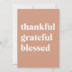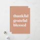 Compartilhe o espírito da temporada com este cartão de Ação de Graças "Agradecido, Grato, Bênção" – um design minimalista e sofisticado que transmite calor e significado em três palavras sinceras. Com um fundo neutro suave e tipografia branca em negrito, é perfeito para enviar mensagens de gratidão a amigos, familiares e entes queridos. Impresso em papel de alta qualidade com sua escolha de formato e envelope, este cartão versátil funciona lindamente para saudações de feriado, bilhetes de agradecimento ou como um complemento elegante para a sua mesa de Ação de Graças. Uma maneira atemporal de espalhar alegria, gratidão e amor neste outono.