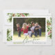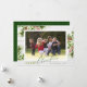 Este cartão de Natal country apresenta uma foto horizontal num fundo de madeira branca de shiplap acentuado com belos ramos de pinheiro em aquarela e bagas vermelhas. A saudação "Feliz Natal" aparece em verde brilhante e verde escuro. O verso é verde escuro com um padrão de pontos verde brilhante. Personalize este cartão com o nome da sua família e ano. Fotografia © Storytree Studios, Stanford, CA
