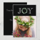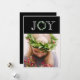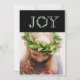 Tipografia "Alegria" elegante com coroa de eucalipto falso para a letra "O". Adicione sua foto pessoal para completar este cartão de Natal. Adicione seu próprio sentimento de Natal e nomes no verso. O padrão da frente é levado para a parte de trás deste cartão.