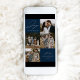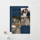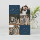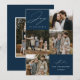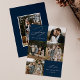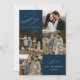 Cartão moderno de férias com a frase "Alegria ao Mundo" em elegante escrita branca sobre um fundo marinho. A frente do design apresenta 4 das suas fotos favoritas da família dispostas em um layout de colagem. Personalize a frente do cartão de férias com várias fotos com o nome da sua família e o ano. O cartão reverte para exibir uma foto adicional.