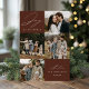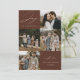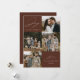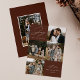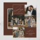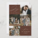 Cartão moderno de férias com a frase "Alegria para o Mundo" em elegante escrita branca com fundo marrom. A frente do design apresenta 4 das suas fotos favoritas da família organizadas em um layout estilo colagem. Personalize a frente do cartão de férias com várias fotos com o nome da sua família e o ano. O cartão reverte para exibir uma foto adicional.