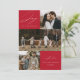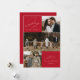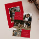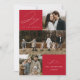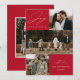 Cartão moderno de férias com a frase "Alegria para o Mundo" em elegante escrita branca sobre um fundo vermelho. A frente do design apresenta 3 das suas fotos favoritas da família dispostas em um layout estilo colagem. Personalize a frente do cartão de férias com várias fotos com o nome da sua família e o ano. O cartão reverte para exibir uma foto adicional.