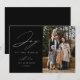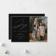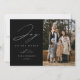 Cartão com fotos de feriado moderno com a frase "Joy to the World" em elegante roteiro branco com fundo preto. Personalize a frente do cartão de feriado elegante com seu nome de família, ano e foto vertical.