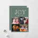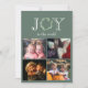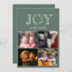 Tipografia festiva "Alegria" para o mundo com coroa de eucalipto falsa para a letra "O". Adicione sua foto pessoal para completar este cartão de Natal. Adicione seu próprio sentimento de Natal e nomes no verso. O padrão da frente é continuado no verso deste cartão.
