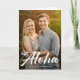 Placa de cartões de natal tropical moderna mostrando sua foto vertical com sangramento de cheio na frente com "Aloha" em um roteiro branco, com letra branca, complementado por uma palmeira desenhada à mão. Personalize a frente do cartão de feriado Aloha adicionando seu nome. A dentro do cartão de feriado Aloha apresenta ondas brancas do oceano contra um fundo azul-cinza claro à esquerda com sua mensagem personalizada à direita. A parte traseira da placa tem espaço para uma foto adicional. Projetado para coordenar com nossa coleção de feriados da Aloha Palm Tree.