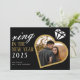 Celebre o seu noivado com este cartão de natal de lançamento na moda e moderno! Apresentando um esquema de cores preto e dourado, um símbolo de anel de diamante chic, e sua bela foto de noivado em um coração ouro, esta carta é a maneira perfeita de compartilhar suas interessantes notícias com a família e os amigos.