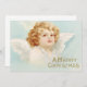Um anjo com uma cabeça ouro de remendos e vestindo um manto branco olha em direção ao céu. O texto diz "Um Feliz Natal". Perfeito para cartões de Natal!
