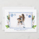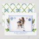 Este lindo cartão de férias apresenta moldura azul em aquarela para uma foto. A moldura é feita de fita azul em aquarela com ornamentos de Natal em estilo chinoiseria e folhagens ao redor da moldura com bagas de Natal. O verso do cartão apresenta folhagens com fita francesa azul.