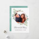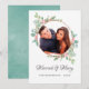 Cartão chic de estilo pastel com aquarela de holly natal casada e alegre, apresentando uma moldura geométrica em rosa dourado, eucalipto, visco e pinheiro complementados por uma lavagem de aquarela em cor menta no verso.