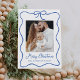 Celebre a temporada com nosso Cartão de Feriado de Foto do Arco 2 Azul Elegante. Esta design encantadora mostra sua querida foto familiar cercada por uma fita azul festiva, completa com um arco no topo. O fundo branco destaca lindamente a saudação manuscrita de "Feliz Natal" em roteiro azul, que pode ser personalizado com uma saudação de sua escolha. Adicione seu nome de família para um toque pessoal. A parte traseira apresenta espaço para uma segunda foto e uma mensagem sincera. Perfeito por compartilhar alegria com entes queridos nesta temporada de festas!