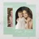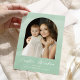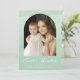 Cartão de Páscoa elegante com sua foto dentro de uma moldura em arco com fundo de aquarela verde menta. A frase "Desejos de Páscoa" é exibida abaixo em uma fonte de caligrafia branca. Personalize a frente do cartão de Páscoa verde menta adicionando seu(s) nome(s). O cartão se inverte para exibir uma foto adicional com o ano ou texto personalizado mostrado abaixo.