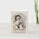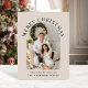 Elegante cartão de Natal dobrado bege claro com a sua foto num arco, "Feliz Natal" em tipografia serif clássica e uma saudação de temporada e o nome da sua família em tipografia moderna simples. No interior, personalize a sua mensagem para amigos e familiares.