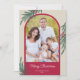 Um cartão de Natal elegante com uma moldura de foto arqueada trendy. O design é acentuado com folhagem de inverno e bagas e uma cor vermelho escuro.