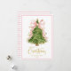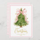 Belo e elegante cartão de Natal Feliz com uma linda árvore de Natal com um grande arco rosa. Listras brancas e cor-de-rosa nas costas. Veja a coordenação de itens no nosso compro, Encantado Finch.