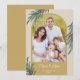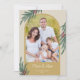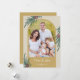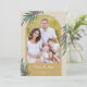 Um cartão de Natal elegante com uma foto arqueada na moda. O design é acentuado com folhagem de inverno e frutos vermelhos em um fundo dourado.
