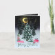 Uma cena noturna apresenta uma árvore de Natal enfeitada com luzes coloridas, cercada por árvores altas e verdes. A lua crescente brilha no céu, e as caixas de presentes estão organizadas na base da árvore com uma mensagem festiva de "Feliz Natal". A mão desenhada em Procreate com tanto amor.
