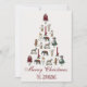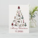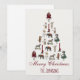 Uma Árvore de Natal feita de brinquedos antigos: bonecas vestidas de vermelho, verde ou branco, cavalos de brinquedo, ursos de pelúcia, macacos, elefantes e palhaços e também velas vermelhas. Na base, há tipografia: a mensagem "Feliz Natal" escrita em um elegante tipo de letra caligráfica vermelha e abaixo dela, o nome em letras vermelhas à mão.