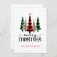 Cartão de Natal com xadrez vermelho e preto e árvores de Natal xadrez verde e preto na frente com um espaço para o seu nome. O verso do cartão tem uma mensagem que você pode editar.