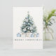 Enviar desejos quentes embrulhados em elegância de eterno com este cartão de Natal de cor d'água ilustrado de forma elegante. Apresentando uma serena árvore de Natal verde adornada com ornamentos de pasta azul, poinsetos brancos de inverno, revestidos com uma estrela prateada e delicados presentes envoltos em tons azuis e neutros na base. Feliz saudação de Natal na fonte para corresponder à ilustração abaixo. O fundo texturizado falso e o design capturam o espírito de um Natal aconchegante e clássico. Cor sólida e cartões de natal personalizável e assinatura no verso.