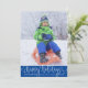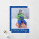 A saudação HAPPY HOLIDAYS está em um script branco manuscrito retrocedido por uma borda azul brilhante editável. (DICA DA FOTO: para obter resultados mais rápidos/melhores, escolha uma foto com o assunto no meio e/ou faça um pré-recorte para uma forma semelhante, conforme mostrado ANTES de carregar e ela preencherá o espaço de fotos fornecido perfeitamente.) MUDANÇA DE COR: Você pode alterar a cor azul de fundo na frente e atrás para coordenar com sua foto clicando na guia PERSONALIZAR. Entre em contato com o designer se quiser que este design seja modificado ou em outro produto.