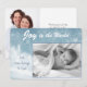 Duas das suas fotografias especiais tomam o centro das atenções neste moderno cartão de Natal. A foto da frente está emoldurada dentro de um belo fundo azul e branco com efeito bokeh. O texto branco no topo diz "JOY to the World", enquanto o seu texto de assinatura personalizado está em azul cinza claro no lado esquerdo da fotografia. A parte traseira do cartão tem outro campo de modelo de foto, com o seu texto em cinza e azul no lado direito. Simples elegância que deixa suas fotografias brilharem!