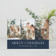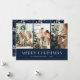 Foto botânica azul e vermelha personalizada Cartão de Natal Merry com uma colagem fotográfica sobre fundo azul escuro. Um padrão botânico azul, vermelho e branco no fundo. Personalize facilmente este elegante cartão de Natal fotográfico com as suas fotografias e texto.