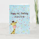 Girafa-bebê bonita sobre fundo azul com estrelas coloridas