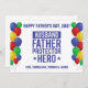 Mostre apreço pelo papai no Dia dos Pais deste ano com um cartão especial. "Marido Pai Protetor Herói" em azul com balões azuis, verdes, amarelos e vermelhos nas bordas esquerda e direita em fundo branco. Modelos de texto criados para você para a frente e mensagem no verso.