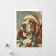 Capture o espírito festivo com um charmoso cobrir de cartão de Natal com um charmoso cesto enfeitado em um chapéu de Papai Noel, cercado por luzes cintilantes e um pano de fundo de terra maravilhosa de inverno de neve.