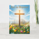 A wooden cross stands in a field of spring wildflowers under a blue sky, reminding us of Christ's sacrifice and resurrection. Beautiful Christian symbolism.
